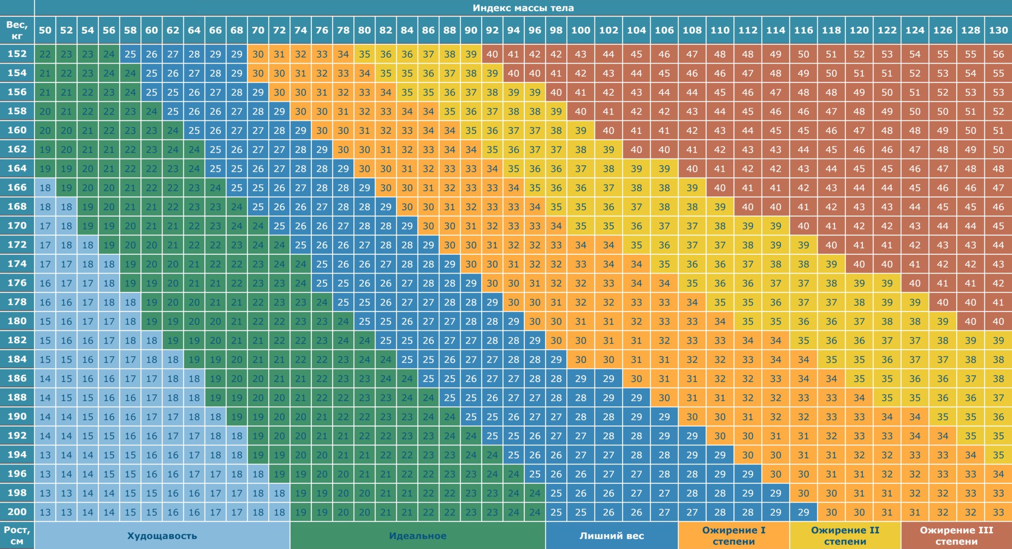 Таблица соотношения роста и массы тела у женщин